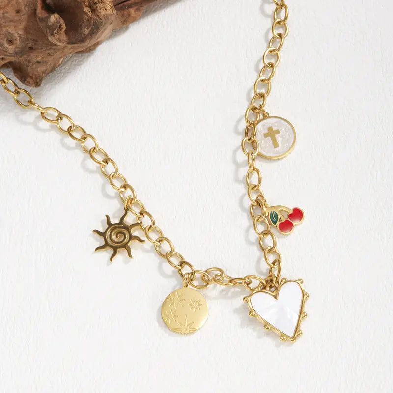 Golden Grace: Bow Pendant Necklace with Heart and Flower Charms